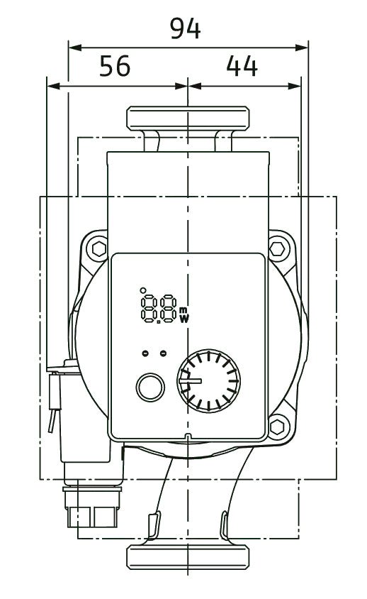 - LED-merkkivalo asetusarvon säätöä varten ja vallitsevan kulutuksen (W) ja virtauksen (m³/h) näyttö