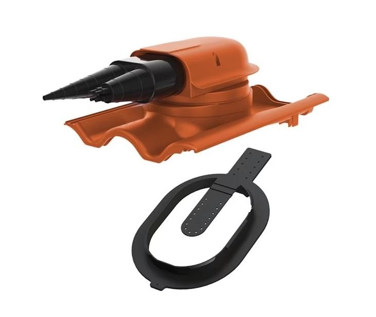 Käyttökohteet: Kaapeleiden läpivientiin. Sopii yleisimpiin betonitiiliin, kun tiilen leveys on 330 mm. Korvaa yhden 2-aaltoisen kattotiilen. Sisältö: Läpivienti, kaapeliläpivientikumi, aluskatetiiviste Click, kaulus, kansi, ruuvit, asennusohje/sapluunat aluskaterenkaalle ja läpiviennille.