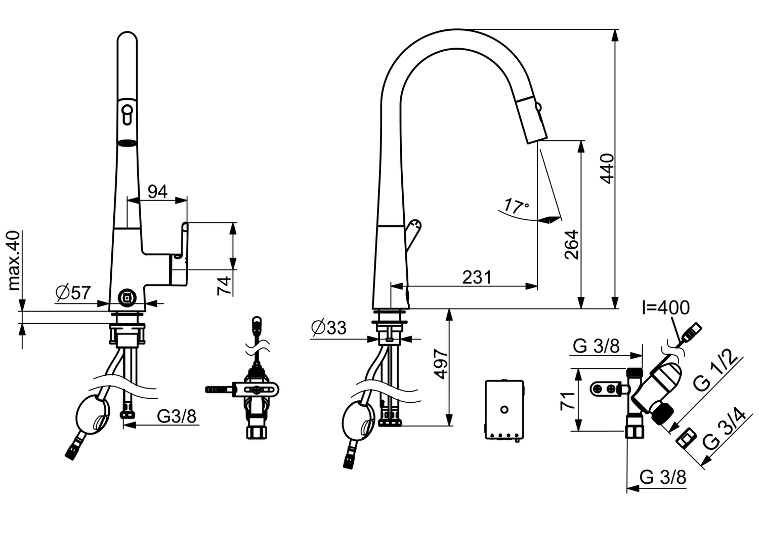 - juoksuputken tyyppi: kääntyvä juoksuputki, ulosvedettävä, kääntymiskulman rajoitusmahdollisuus
