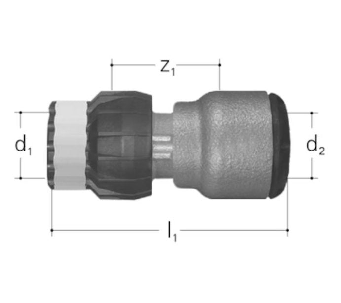 Muunnosliitin, joka mahdollistaa Sanipex MT-putkien yhdistämisen RST-putkiin (DVGW W541) ja puhtaisiin kupariputkiin (DIN EN 1057).
