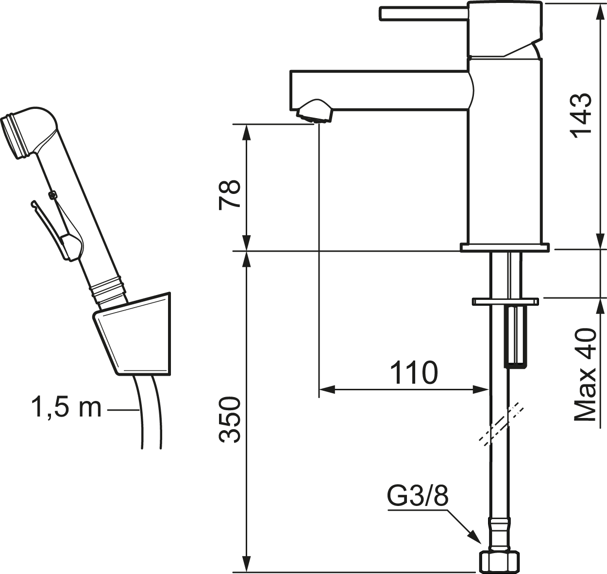 - itsesulkeutuva käsisuihku, letkun pituus 1500 mm