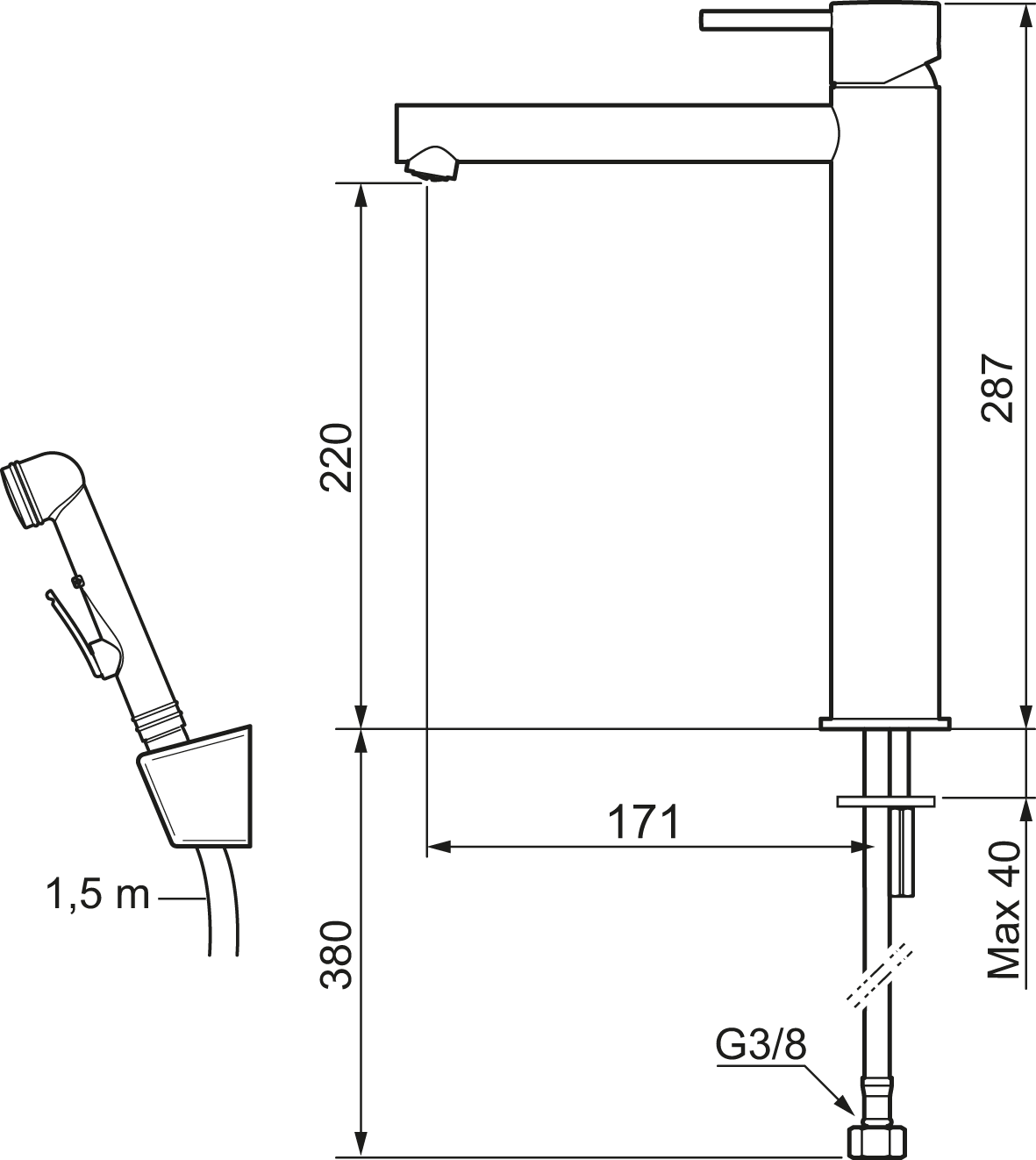 Ominaisuudet- itsesulkeutuva käsisuihku, letkun pituus 1500 mm