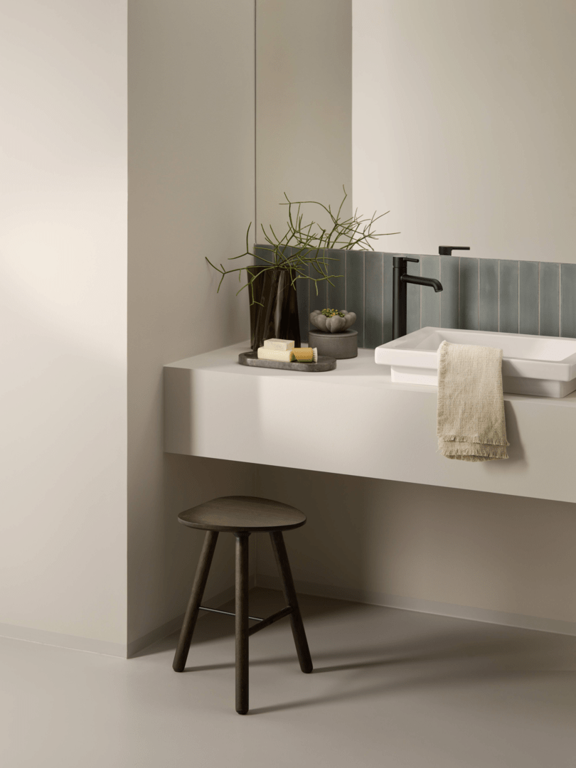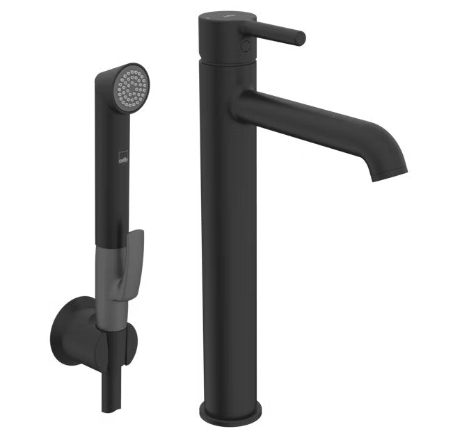 Oras Optima Style 2602FH-33 on mattamusta korkea pesuallashana, jossa on Bidetta-käsisuihku, puikkomainen vipu ja joustavat kytkentäputket. Hanan virtaama on 6 l / min.