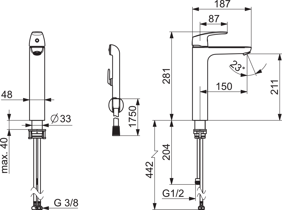 - suihkun osat: suihkupidike, suihkuletku (1750 mm)