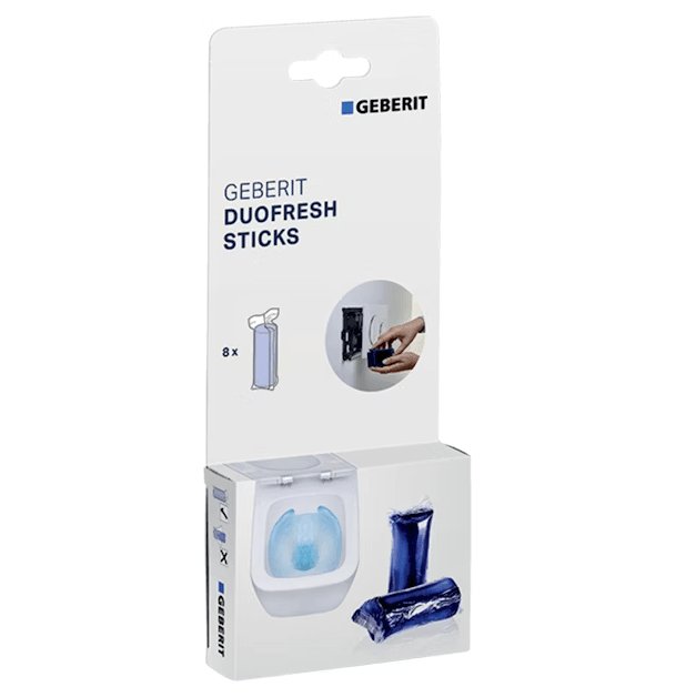 Geberit DuoFresh -raikastinpuikko. Geberit DuoFresh -raikastinpuikon annostelijalle. Kalkki- ja virtsakivikerrostumien ehkäisemiseen. Värjää huuhteluveden siniseksi. Sisältää kotelon, jossa 8 Geberit DuoFresh -raikastinpuikkoa.