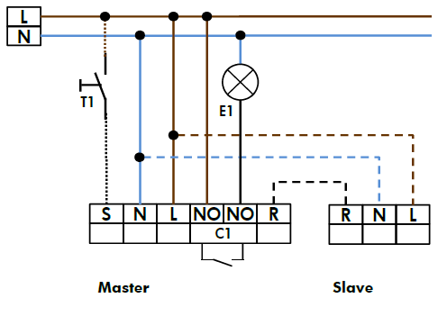Pakko-ohjaus. Kytkemällä 230V jännite jatkuvasti Slave tuloon R (jännite päällä yli 10 sekuntia) valot jäävät palamaan päälle niin kauan kun jännitettä syötetään Slave tuloon. Kun jännite kytketään irti Slave tulosta tunnistin sammuttaa valot ja palaa automaattitoimintoon.