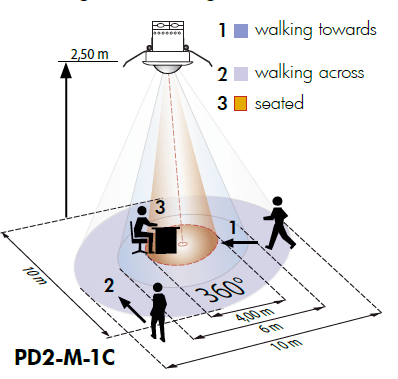 Kauko-ohjattavat, kattoon asennettavat PD2-M-1C –masterläsnäolotunnistimet pinta-, kojerasia- ja välikattoasennusversioina ympyränmuotoisella valvonta-alueella. Yksi potentiaalivapaa rele (NO) joka ohjaa valaistusta. Erittäin kehittynyt valaistuksen mittaus ja laskenta joka käyttää integroitua linssin sisäpuolella sijaitsevaa valoisuusanturia. Tunnistin sammuttaa keinovalon vasta kun se on varma, että tilaan jää tarpeeksi luonnonvaloa. Tunnistimeen voidaan liittää 230V AC painonapin jolla valaistusta voidaan sytyttää /sammuttaa. Painonapissa ei saa olla indikaatiolamppua.