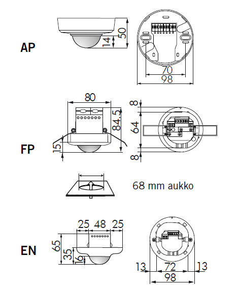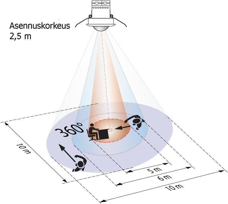 Luxomat läsnäolotunnistin Slave, uppoasennus. Ø 10 m, asennuskorkeus 2,5 m. Orjatunnistin laajentamaan Master tunnistimen valvonta-aluetta. Master tunnistimeen voi liittää rajoittamaton määrä orjatunnistimia.