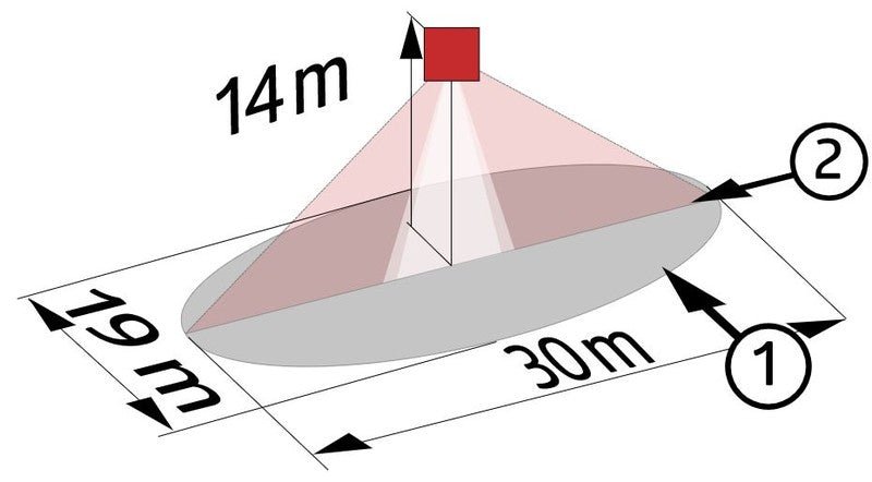 • Valvonta-alue 14m asennuskorkeudessa: ovaali 30 m ja 19 m sivusuunnassa sekä kohti tunnistinta