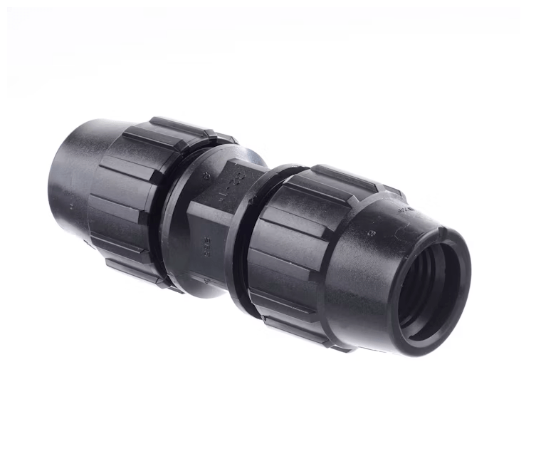 Helposti ja nopeasti asennettava PE-putken liitin. Liitin on valmistettu polypropeenista (PP) ja kiristysrenkaan materiaali on polyoksimetyleeni (POM).