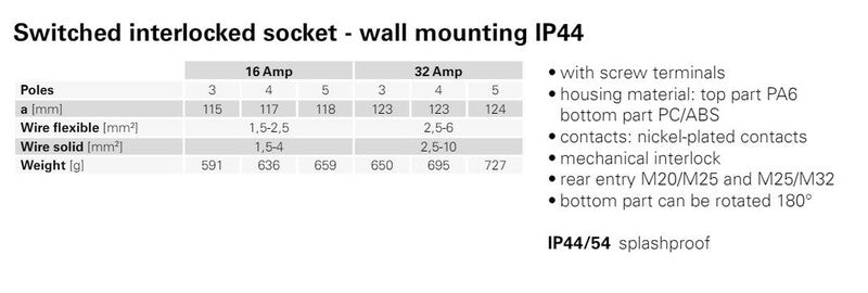 Sarjasta löytyy 16 ja 32 A:n (3-, 5-napaiset) pistorasiat. IP44/IP54 tai IP66/IP67. Erikoistilauksena myös 4-napaiset versiot.