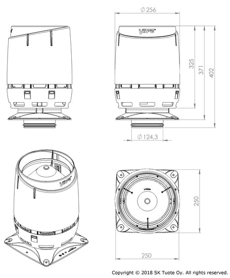 Mitat: Kanavakoko Ø 125 mm. Asennussarjan pinta-ala 250 x 250 mm. Asennuspinnan on oltava vähintään saman kokoinen.