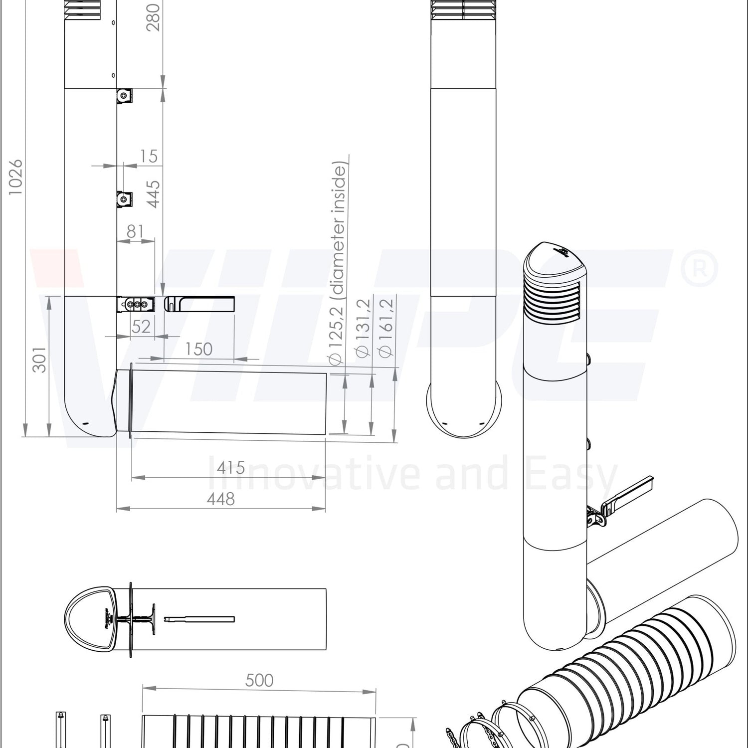 Mitat: Kulmaputken sisähalkaisija 125 mm ja ulkohalkaisija 132 mm.