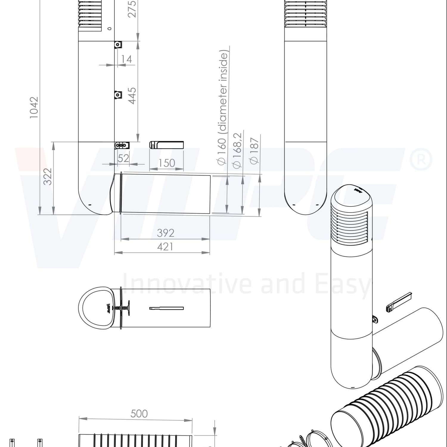 Mitat: Kulmaputken sisähalkaisija 160 mm ja ulkohalkaisija 168 mm.