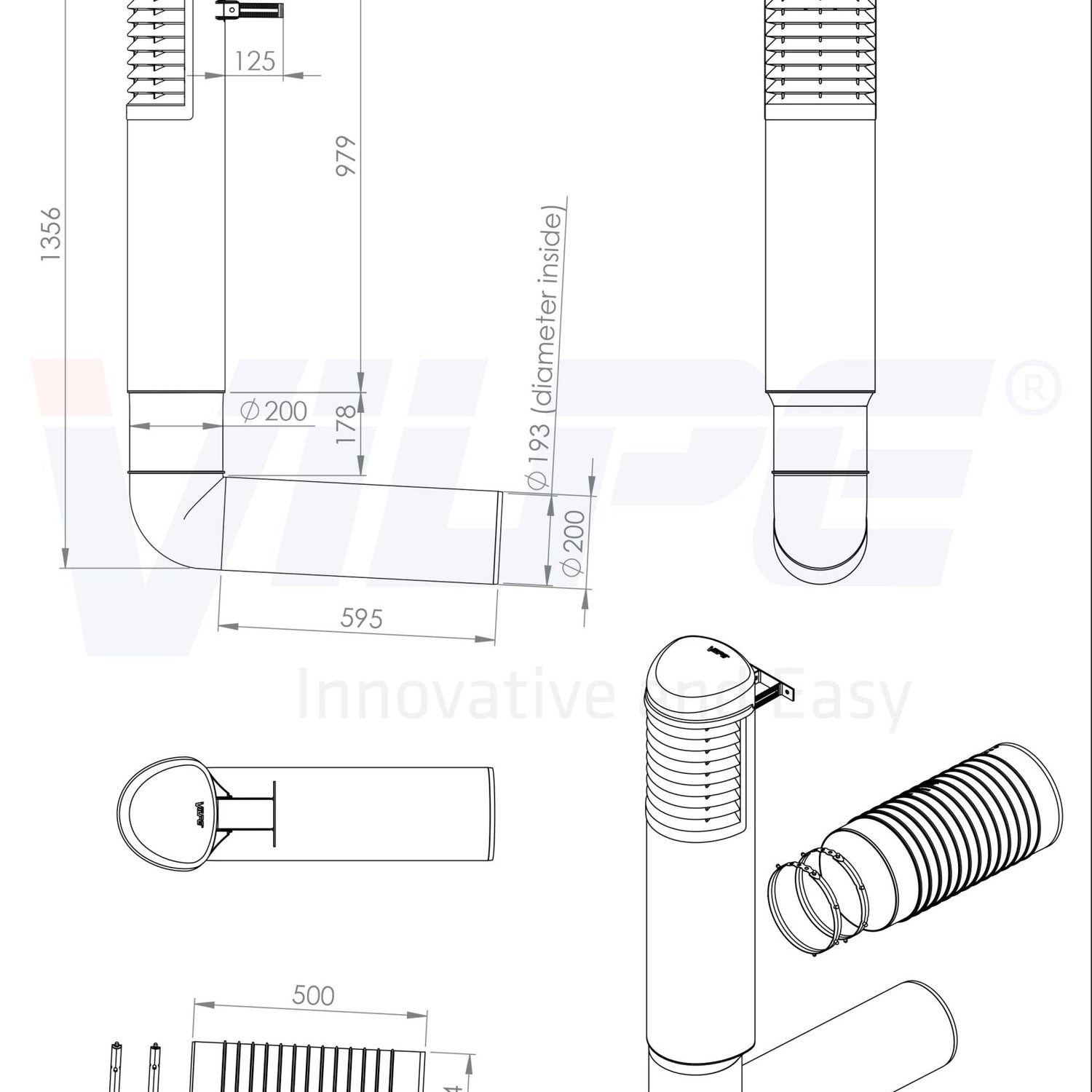 Mitat: Kulmaputken sisähalkaisija 193 mm ja ulkohalkaisija 200 mm.