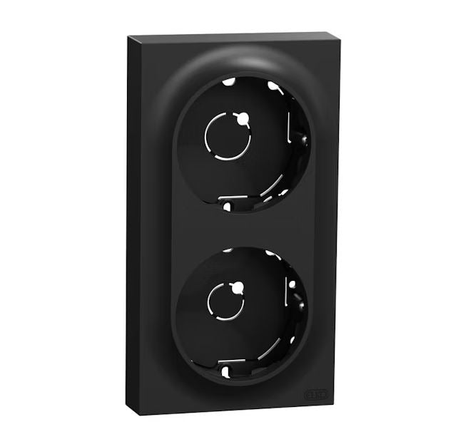 ELKO One 2-pintakojerasia matala musta. Tämä matala versio on optimoitu kytkimille, joissa on ruuviliittimet. Kun asennus tehdään olemassa olevan upporasian päälle, poistamalla pintakojerasian pohja, voidaan myös matalaan pintakojerasiaan asentaa