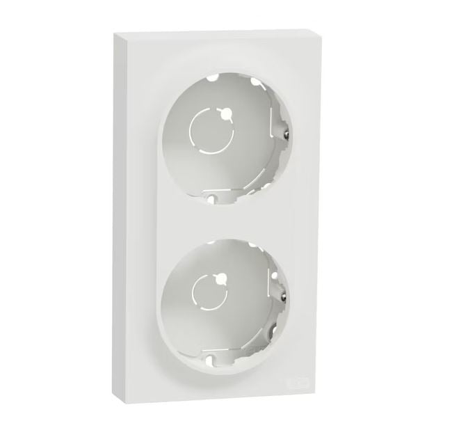 ELKO One 2-pintakojerasia matala valkoinen. Tämä matala versio on optimoitu kytkimille, joissa on ruuviliittimet. Kun asennus tehdään olemassa olevan upporasian päälle, poistamalla pintakojerasian pohja, voidaan myös matalaan pintakojerasiaan asentaa