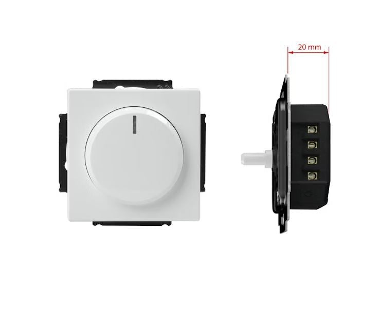 LED kiertonuppisäädin, Impressivo. Matala Impressivo LED-valonsäädin, sisältää kojeen ja keskiölevyn. LED-valonsäätimen upotussyvyys on 20 mm. Valonsäätimessä N-liitin nollajohdon kytkemistä varten. Joissakin tapauksissa LED valaisimien ja säätimen yhteensopivuudessa voi ilmetä ongelmia. Nämä poistuvat yleensä kun säätimeen kytketään myös nollajohdin. Huom! Nollajohdinta ei ole pakko käyttää, säädin toimii myös 2-johdin versiona!