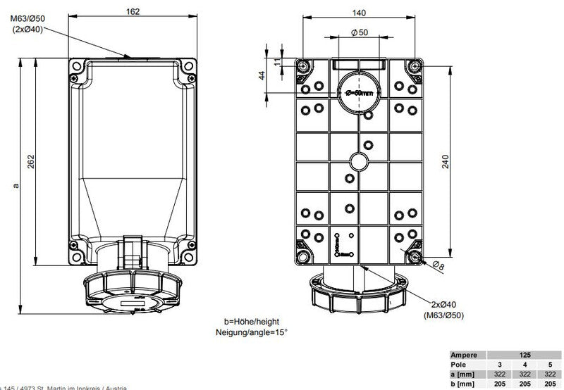 Onnline pinnallinen voimapistorasia 125A 5-napainen 400V IP67. Pistorasiassa ruuvattavat liittimet. Yksi kaapeliläpivienti rasian yläosassa ja pohjassa ja kaksi rasian alaosassa. Valikoimasta löytyy myös vastaava malli 63A versiona.