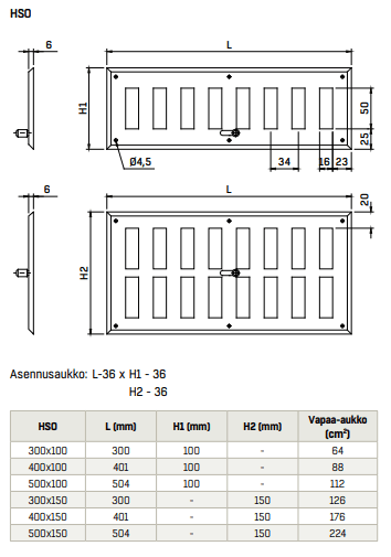 Vapaavirtaussäleikkö Fläktgroup HSO 400x100