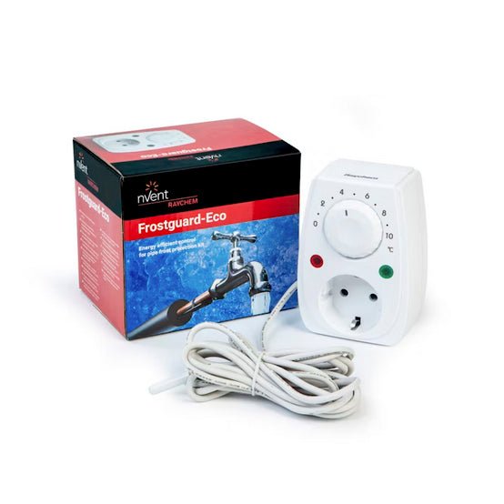 FrostGuard-Eco-termostaattia käytetään FrostGuard-sulanapitokaapelin kanssa ja se on tarkoitettu lämpötilan ja energiankulutuksen valvontaan. Se säästää energiaa jopa 80 % verrattuna järjestelmään ilman termostaattiohjausta. Sisältää putken kylkeen asennettavan anturin. Kotelointiluokka IP21.