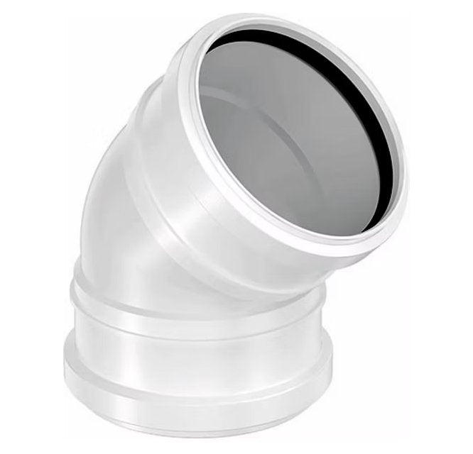 Uponor Decibel muhvikulma 160 mm halkaisijalla ja 45 asteen taivutuskulmalla. Materiaali mineraalitäytteinen polypropeeni. Uponor Decibel on ääntä vaimentava paineeton kiinteistöviemäröintijärjestelmä, jota käytetään rakennuksen sisäpuolisessa viemäröinnissä sekä uudis- että saneerauskohteissa. Decibel-järjestelmä on yhteensopiva perinteisen Uponor HTP-kiinteistöviemäröintijärjestelmän kanssa. Decibel-järjestelmää käytetään erityisesti ääniteknisesti vaativissa kohteissa.