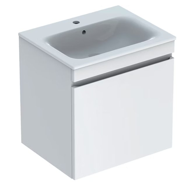 Geberit Renova Plan -allaskaappipaketti, slim rim, yhdellä laatikolla ja yhdellä sisälaatikolla: B=98,8cm, H=62,2cm, T=48cm, pesualtaan leveys=100cm, hikkoripuu vaalea / kalvo strukturoitu, valkoinen