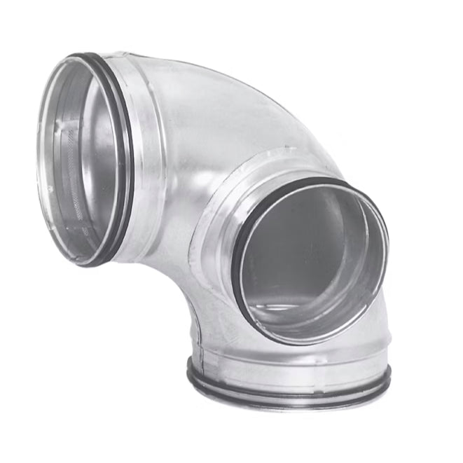 Syvävedetty ja hitsattu kulmayhde erillisellä puhdistusluukun liitännällä. Kulmayhteen Safe-liitäntä sopii puhdistusluukulle. Ratkaisu antaa pienemmän painehäviön kuin T-yhde. Liitäntää voidaan käyttää myös SR-kanavan liittämiseen.