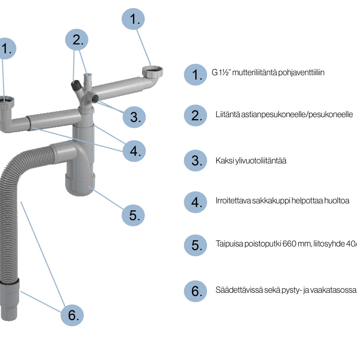 - Kompakti: Flexlocin matala rakenne lisää vapaata korkeustilaa. Vesilukko voidaan asentaa myös allaskaapin takaseinään, jolloin se vie vain 76 mm tilaa. Hyvin kapeissa tiloissa pohjaventtiilit voidaan lyhentää.