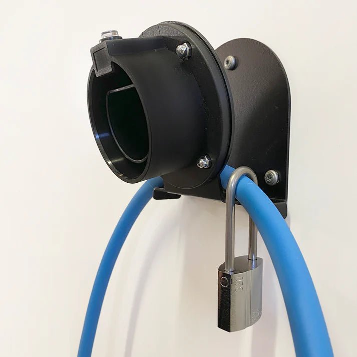 - Latauskaapeli voidaan lukita telineeseen erillisellä riippulukolla (lisävarusteena saatavissa), pitäen sen turvallisesti paikallaan ja välttäen maassa lojuvia kaapeleita.
