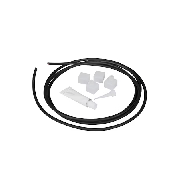 LEDstrip Neon Side IP67 -liitäntäsarja. Sisältää 2 päätetulppaa ja 2 kaapelien päätyliitäntää, 2 metriä (mustaa) kumipintaista kaapelia ja 10 ml:n silikoniputkilon.