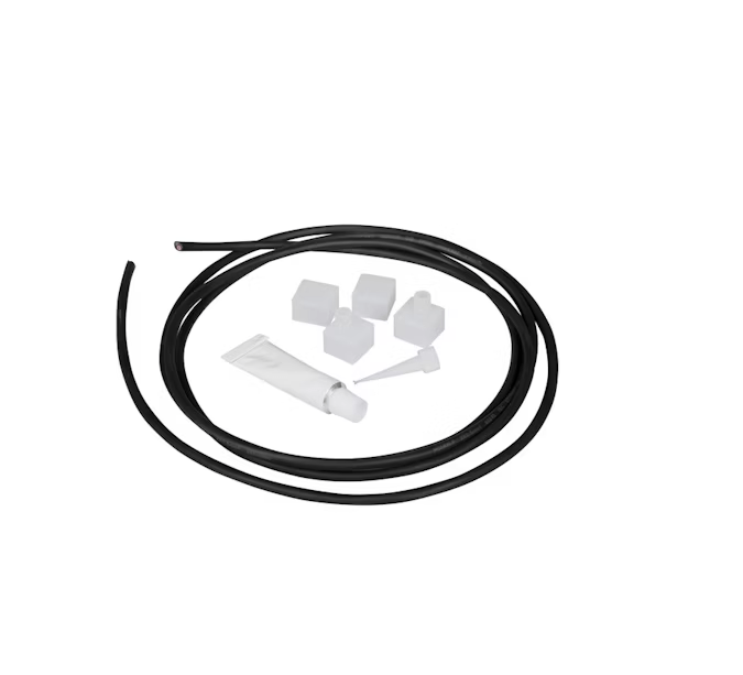 LEDstrip Neon Mini IP67 -liitäntäsarja. Sisältää 2 päätetulppaa ja 2 kaapelien päätyliitäntää, 2 metriä (mustaa) kumipintaista kaapelia ja 10 ml:n silikoniputkilon.