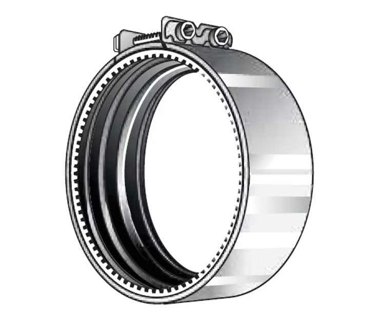 Pitkittäisvoimia ankkuroiva pantaliitin putki- ja osaliitoksiin. Käytetään esim. pohjakulman liittämisessä. Luo vetolujan putkiliitoksen, joka kestää kolmen barin sisäpuolisen paineen. Pannassa on ruostumattomasta teräksestä valmistetut kynsirenkaat, jotka estävät putkien päiden liukumisen ulos pannasta. Toimitetaan valmiiksi koottuna. Merkitty sinisellä tarralla