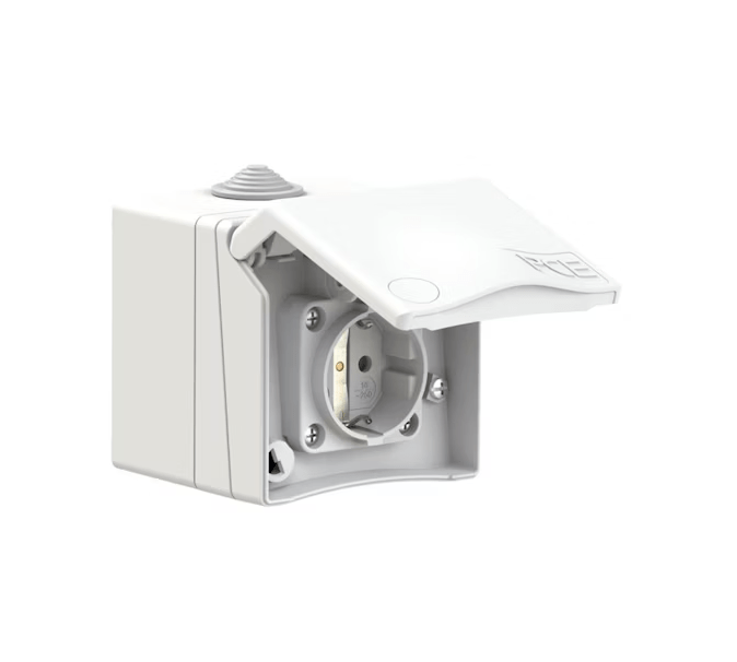 Julkistilan pintapistorasia, jossa pistorasia jää valkoisen suojakannen alla. Tuote sopii kohteeseen jossa kaikki pistorasiaosat ovat suojakannen takana. Pistorasiaan löytyy erillinen lukko, jolla kannen saa lukittua.